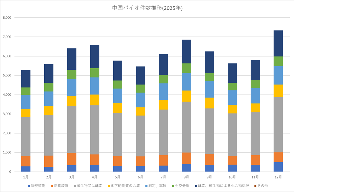 アジア各国の特許について、弊社独自の分類(SPS)に対応するIPC分類で検索し、件数集計して分野別に動向把握しています。